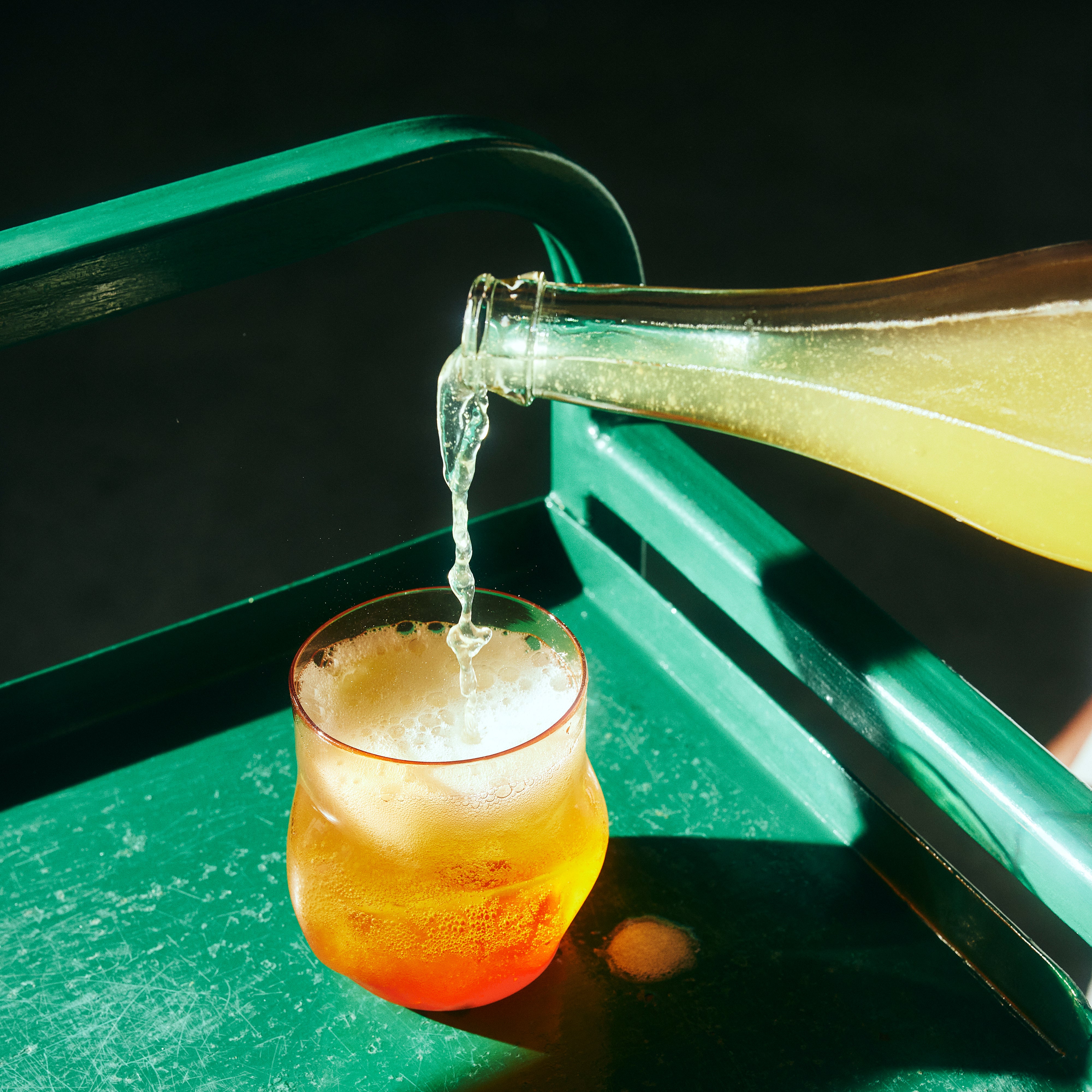 02 – Versez le cidre brut, la liqueur amère d’agrumes et l’eau gazeuse, puis remuez doucement.